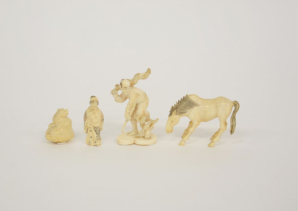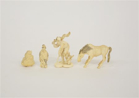 Lotto composto da due netsuke, un piccolo okimono firmato alla base raffigurante contadino ed un cavallino, in avorio (lievi difetti)
