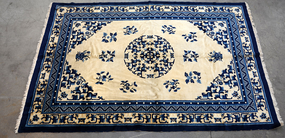[Tappeti] Tappeto Pekino, Cina, secolo XX. Disegno con decoro floreale in blu e azzurro su campo beige d'ispirazione Ning-Xia (cm 267x183)(difetti)