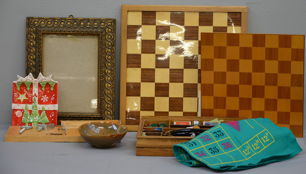 Lotto composto da una scacchiera, una scatola con giochi vari, un posacenere natalizio, una cornice, un porta prosciutto e una ciotola in onice (difetti e mancanze)