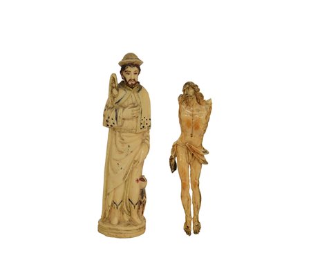 Lotto di due sculture in avorio raffiguranti San Rocco e Cristo crocefisso (h...