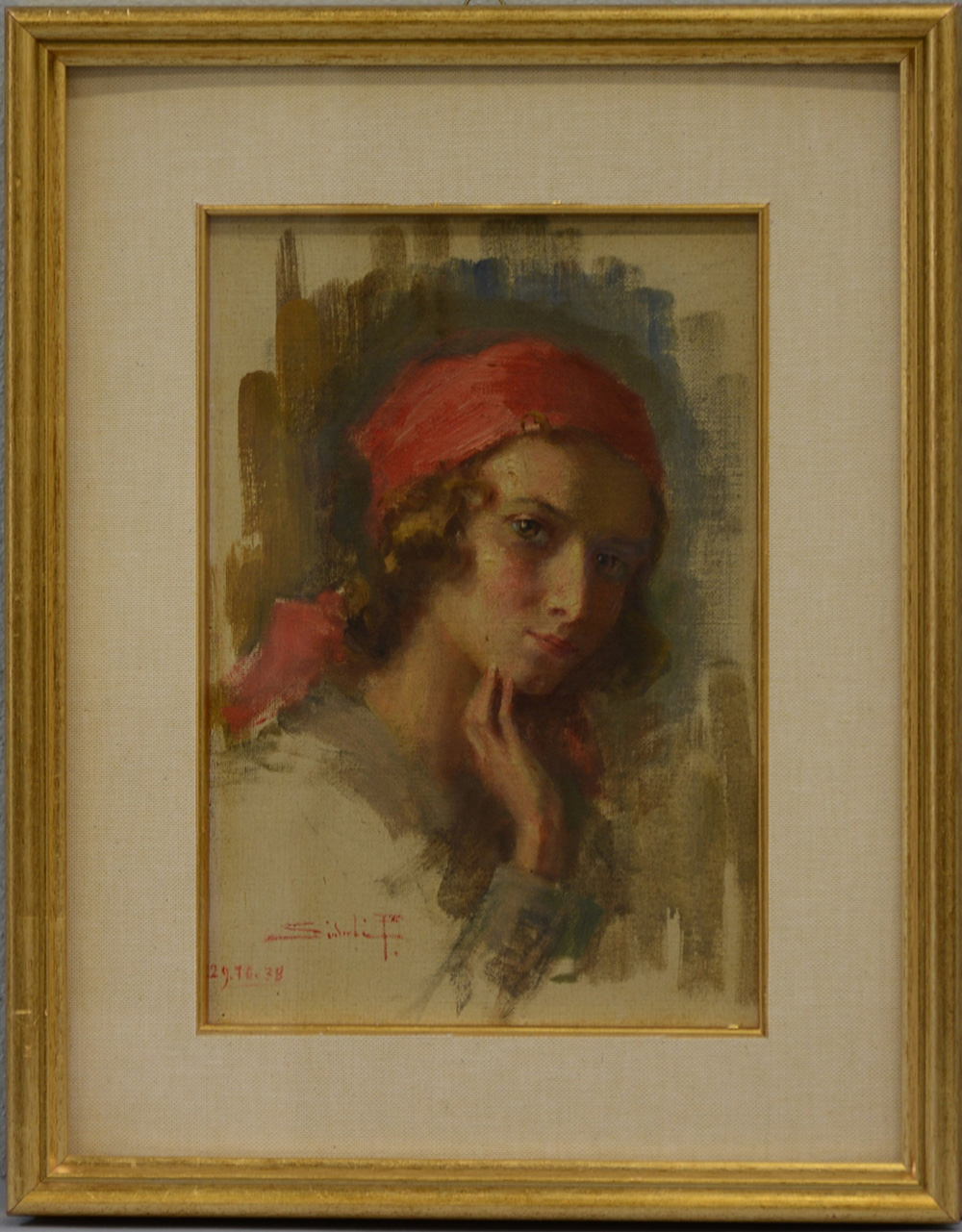 "Ritratto di giovane donna con foulard rosso" olio su tela (cm 26x18), firmato e datato 29/10/1938 in basso a sinistra, in cornice