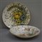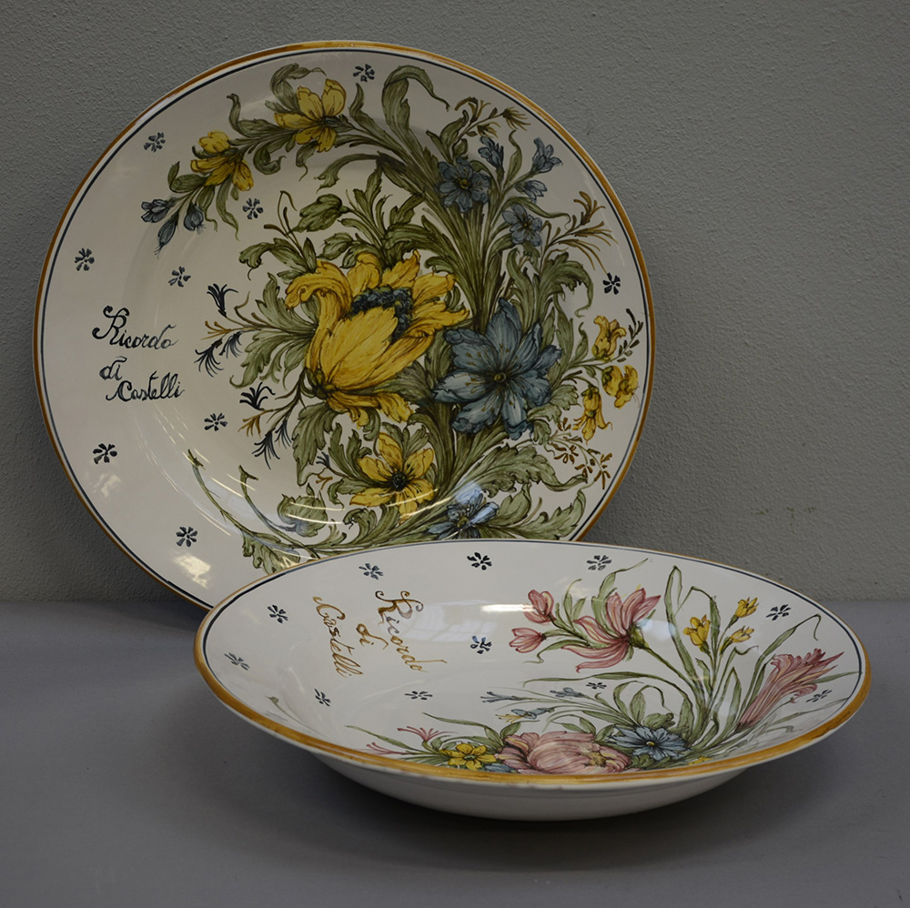 Due piatti in maiolica decorati a fiori, "Ricordo di castelli" (d cm 38)