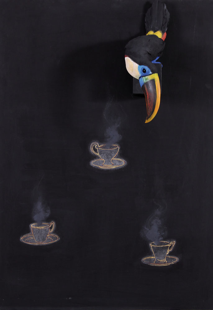 SILVIO MERLINO Napoli 1952 Senza titolo, 1998 tecnica mista e applicazione di scultura policroma (Tucano) cm. 130x90, firma e anno al retro, opera senza cornice.