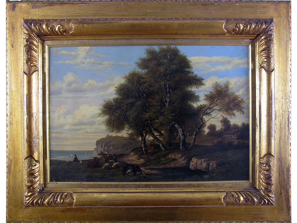 Anonimo (XIX secolo), Olio su tela, Paesaggio costiero con figura e armenti 32,5x46 cm