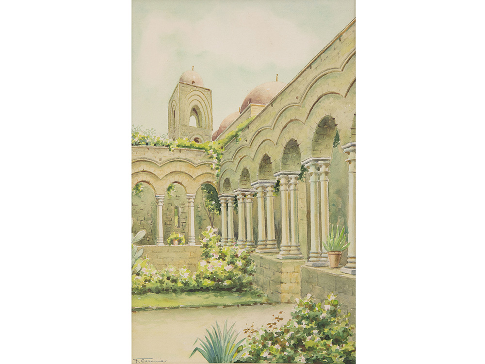 F.Caronia (XX secolo), Acquarello su carta, Chiostro di San Giovanni degli...