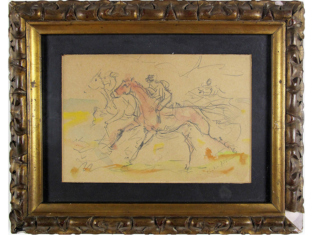Giulio Falzoni (1900-1979), Tecnica mista matita e acquarello su carta, Corsa di cavalli 14x20 cm