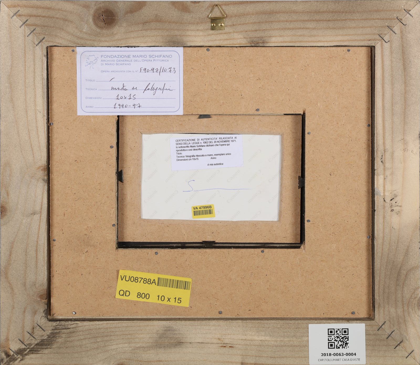 SCHIFANO MARIO (1934 - 1998) Senza titolo. Fotografia ritoccata a mano. Cm 15,00 x 10,00. Timbro a secco MarioSchifano in basso a sinistra. Al retro firma per autentica e cartiglio descrittivo Fondazione Mario Schifano, Roma. Opera archiviata presso la Fondazione Mario Schifano, Roma come da documentazione fotografica allegata all'opera riportante il relativo numero d'inventario. Certificato di autenticità Telemarket, Roncadelle (Bs). Cornice presente