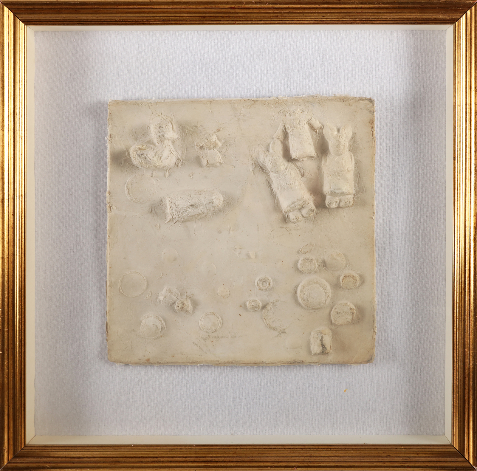 BIANCO REMO (1922 - 1990) Senza titolo. 1956. Impronta su cartone pressato. Cm 33,00 x 33,00. Pubblicazione: Catalogo generale delle opere di Remo Bianco a cura di Adriano Altamira, Mazzotta Edizioni, Volume I, pag. 143, IMP.22 ( il catalogo riporta misure errate). Cornice presente