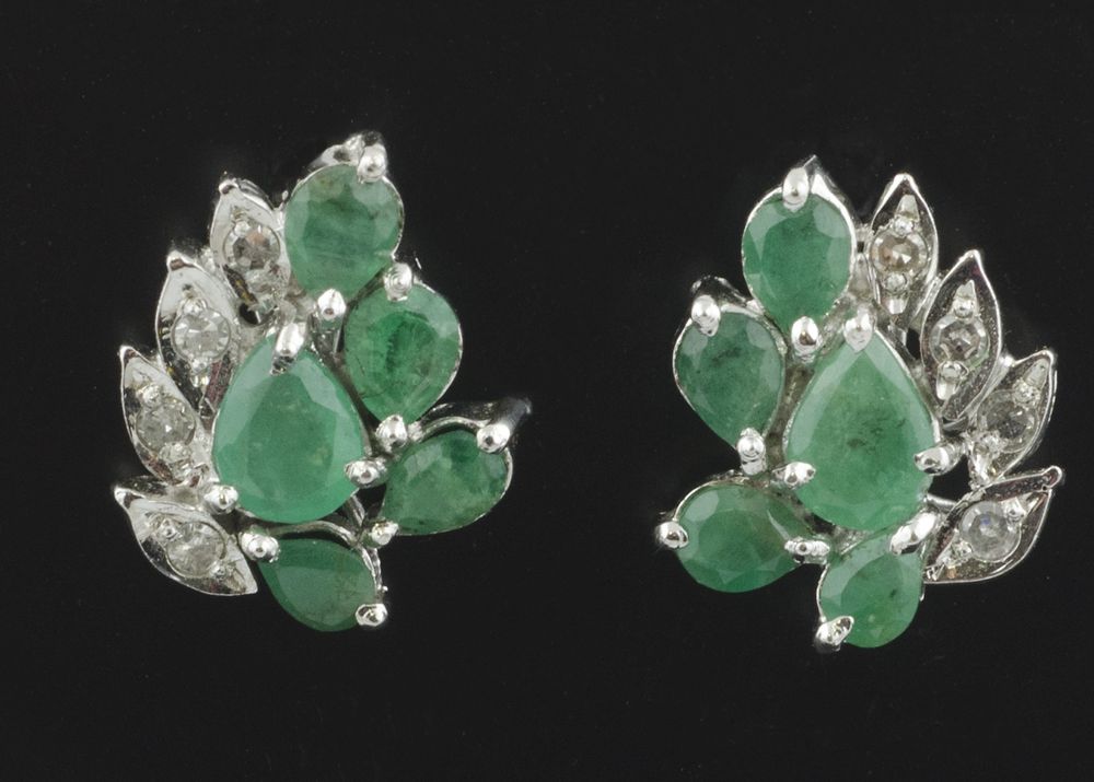 Orecchini oro bianco a forma di foglie con diamanti e smeraldi