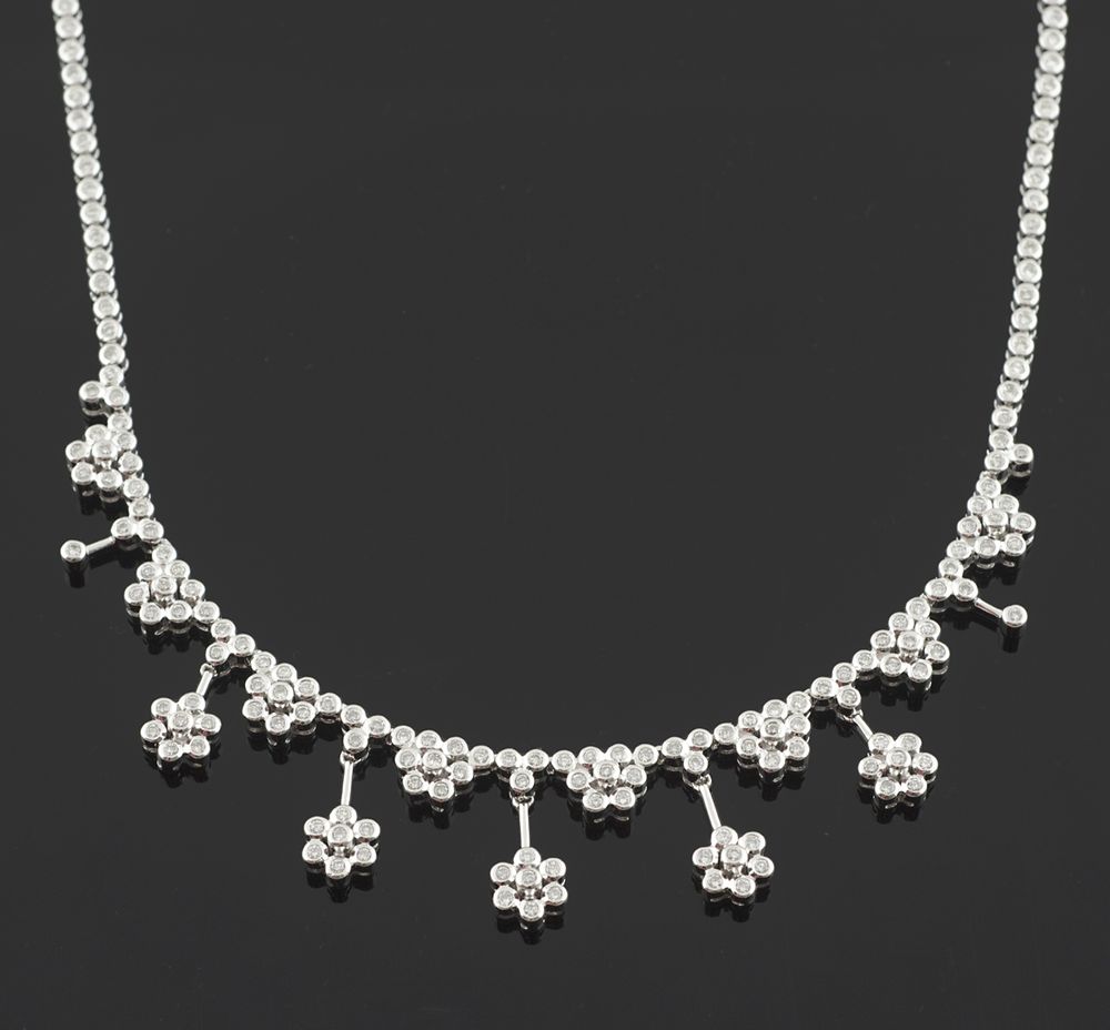 Collier in oro bianco ricoperto da piccoli diamanti con 5 pendenti a forma di fiore.