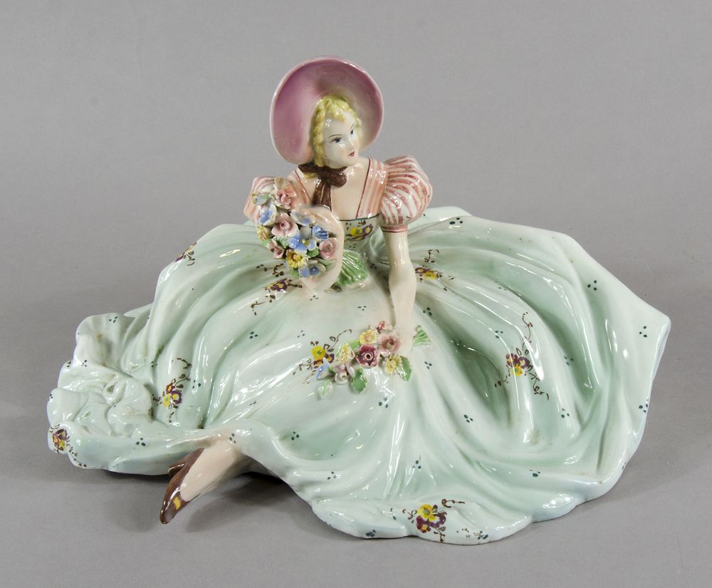 Scultura in ceramica policroma raffigurant gentildonna seduta con fiori. Anni '30. Lung. cm. 37.