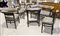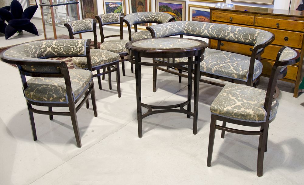 Salotto in legno scuro con imbottitura floreale composto da divano a 2 posti, tavolino ovale, due poltrone a pozzette e tre sedie. Austria, I metà XX secolo.