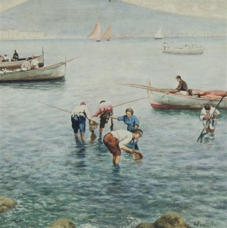 Pittore dell'800 "Marina con pescatori" cm. 33x34 - olio su tavola Firmato Pratella b. a d.