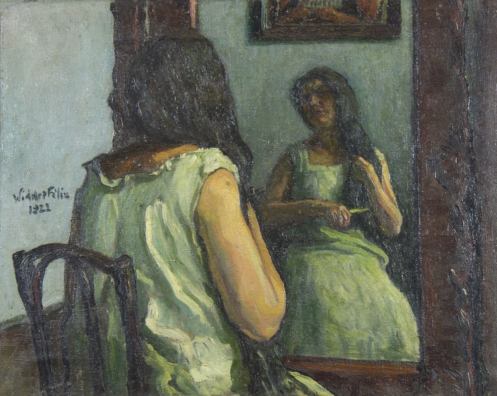 Pittore fine '800 "Allo specchio" cm. 58x74 - olio su tela Firmato a s. e datato 1922.