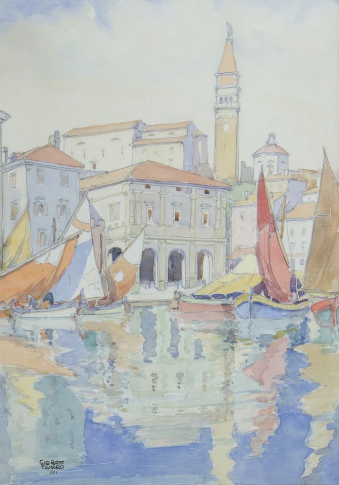 Giorgio Tamaro Attivo ai primi '900 "Veduta di Pirano" cm. 40x28 - acquerello su carta Firmato b. a s. e datato XVI (e.f.)