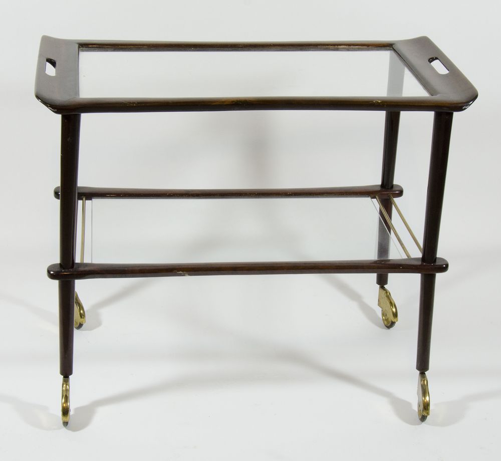 Carrello a 2 ripiani in legno e vetro, con ruote.