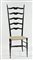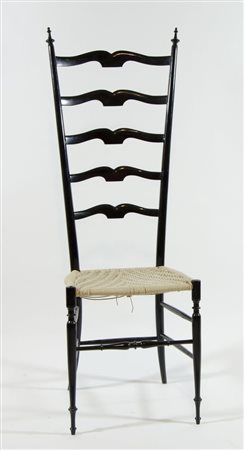 Sedia laccata nera con alto schienale a cartelle orizzontali.