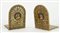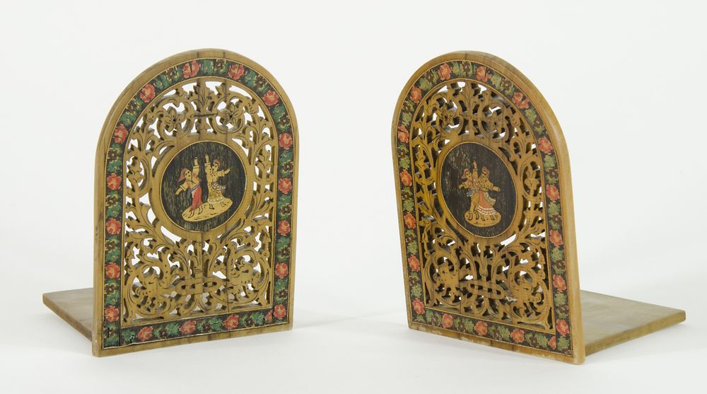 Coppia di fermalibri pieghevoli in legno con intarsi.