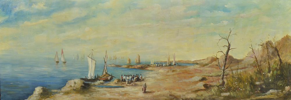 Pittore del '900 "La conquista dell'isola" cm. 40x110 - olio su tela