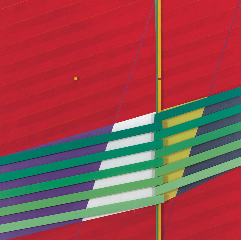 LORENZO PIEMONTI Carate Brianza (Mi) 26/04/1935 Cromoplastico, 2006 acrilici su tela e rilievi in legno cm. 100x100, firma, anno, timbro ed etichetta dell'artista al retro, dichiarazione d'autenticità e archivio dell'artista su foto, entro teca in plexiglass.