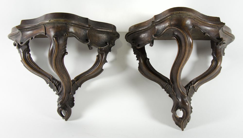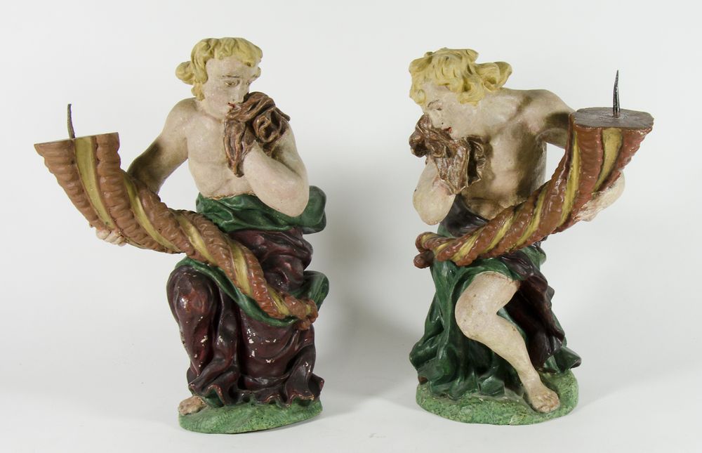 Paio di torcere in legno policromo scolpito raffiguranti personaggi, Austria, XVIII secolo. Assieme vengono vendute due appliques in legno scolpito.