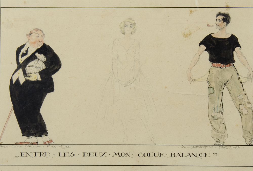 Paolo Caccia Dominioni 1896-1992 "Tra i due l'equilibrio del mio cuore" cm. 20x30 - tecnica mista su carta Firmato b. a s. e datato 1922