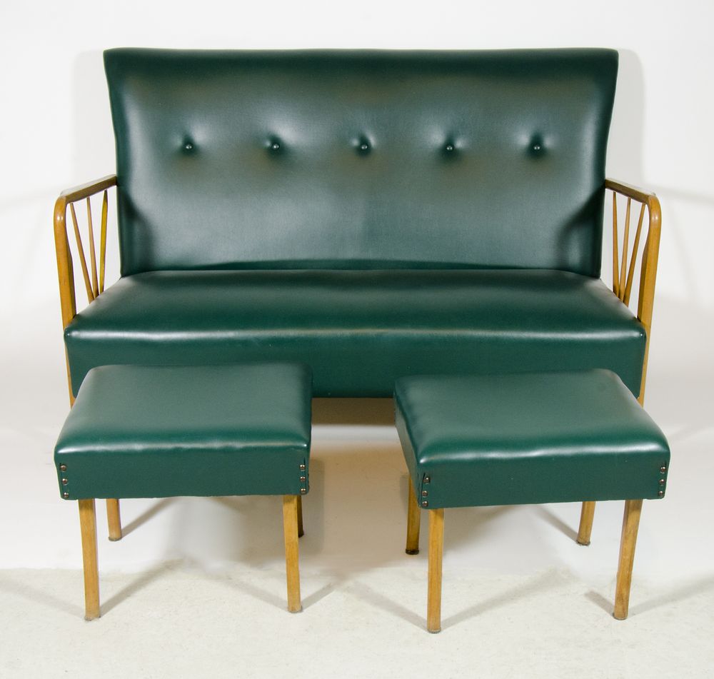 Divanetto a 2 posti e coppia di sgabelli. Anni '40.