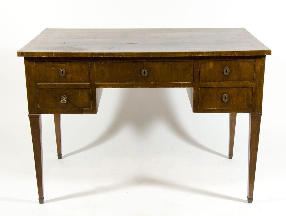 Scrivania da centro a 5 cassetti in legno con intarsi in legni vari a filettature. cm. 83x116x64.