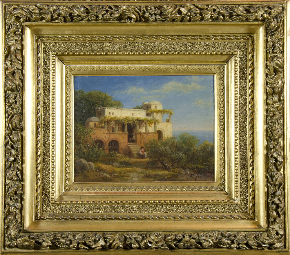 Bernhard Fiedler Berlino 1816-Trieste 1904 "Casa sul mare" cm. 16x21 - olio su tela Firmato b. a d.