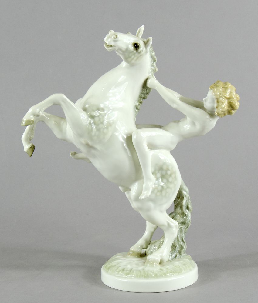 Hutschenreuter: scultura in porcellana policroma raffigurante figura a cavallo. Marcato sotto la base. H. cm. 32. (lieve rottura).