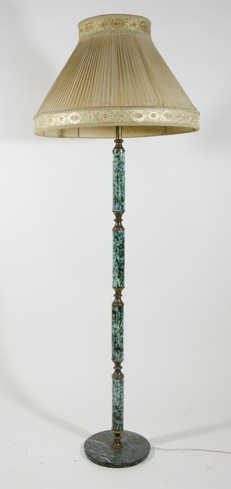 Lampada a stelo in ceramica policroma con base in marmo e struttura in metallo. H. cm. 175.