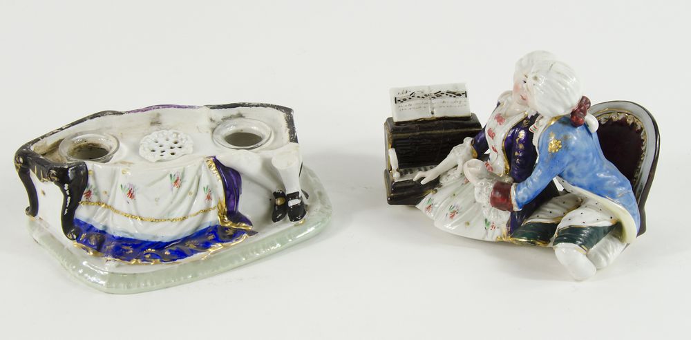 Calamaio in porcellana policroma raffigurante figure con pianoforte. H. tot...