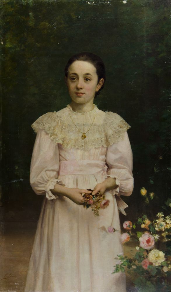 Francesco Beda 1840-1900 "Ritratto tra i fiori" cm. 107x64 - olio su tela foderata (cadute di colore) Firmato b. a s.