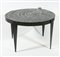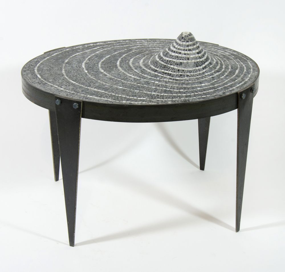 Akomena: tavolo basso di forma ovale con struttura in ferro grezzo, piano lavorato a mosaico. Disegno di F. Nibbia 1994. Timbro sotto al piano "Akomena spazio mosaico-Ravenna Italia". cm. 50x70x50.