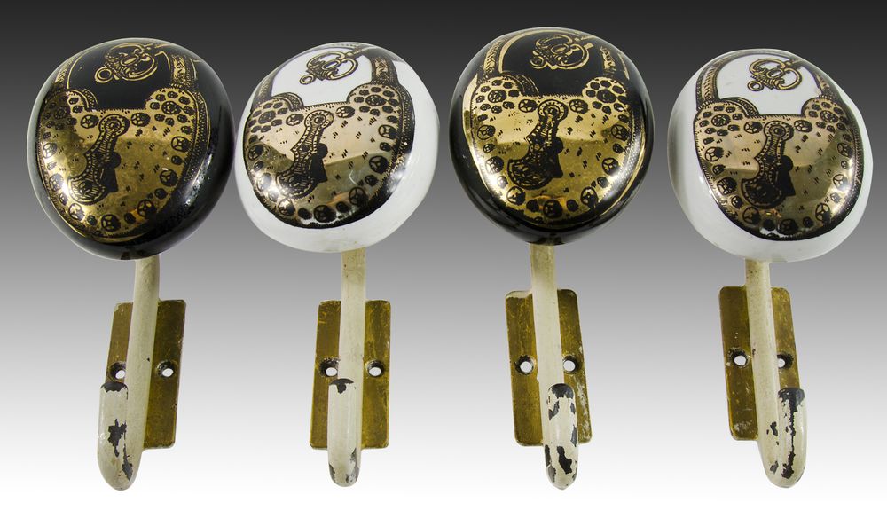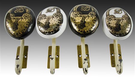 Piero Fornasetti Milano Lotto di 4 appendini in ceramica con decori policromi, tutti firmati.
