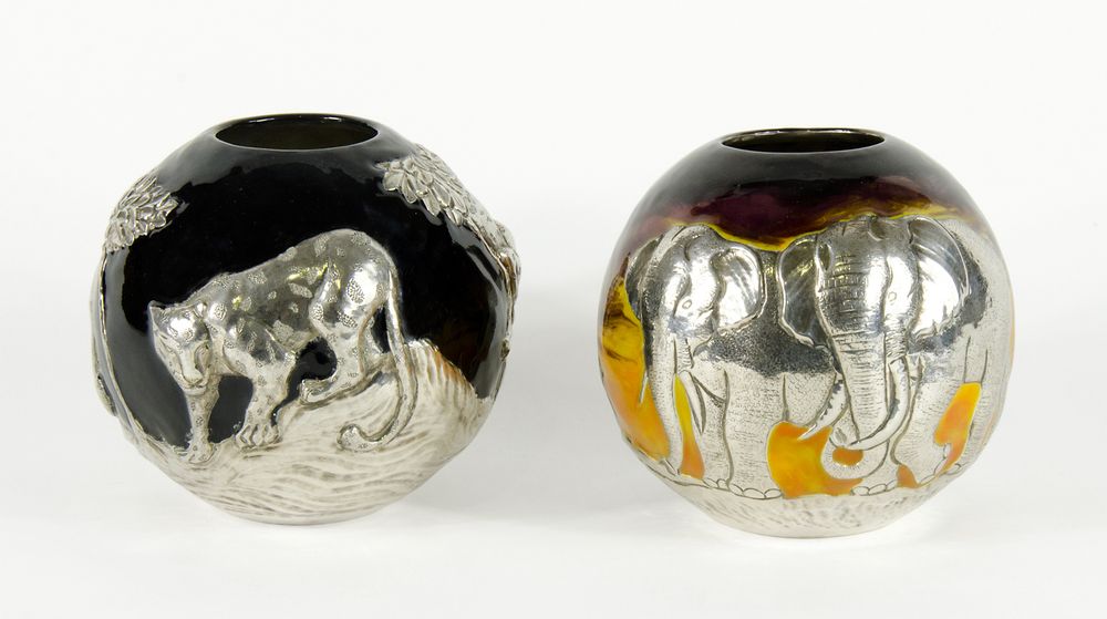 Brandimarte: lotto di 2 vasi a boccia in argento e smalti decorati con figure di animali. H. cm. 13,5.