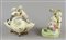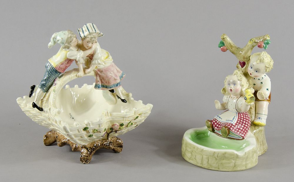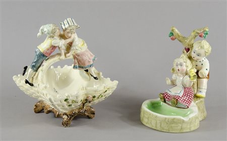 Lotto di 2 sculture in ceramica policroma raffiguranti ragazzine e cestino con manico. Anni '30.