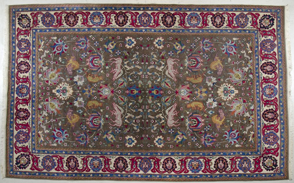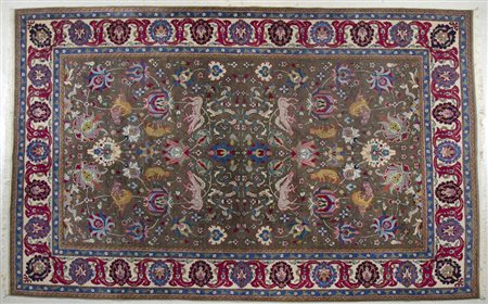 Tappeto su fondo marrone con decoro di animali, cm. 200x300.
