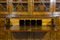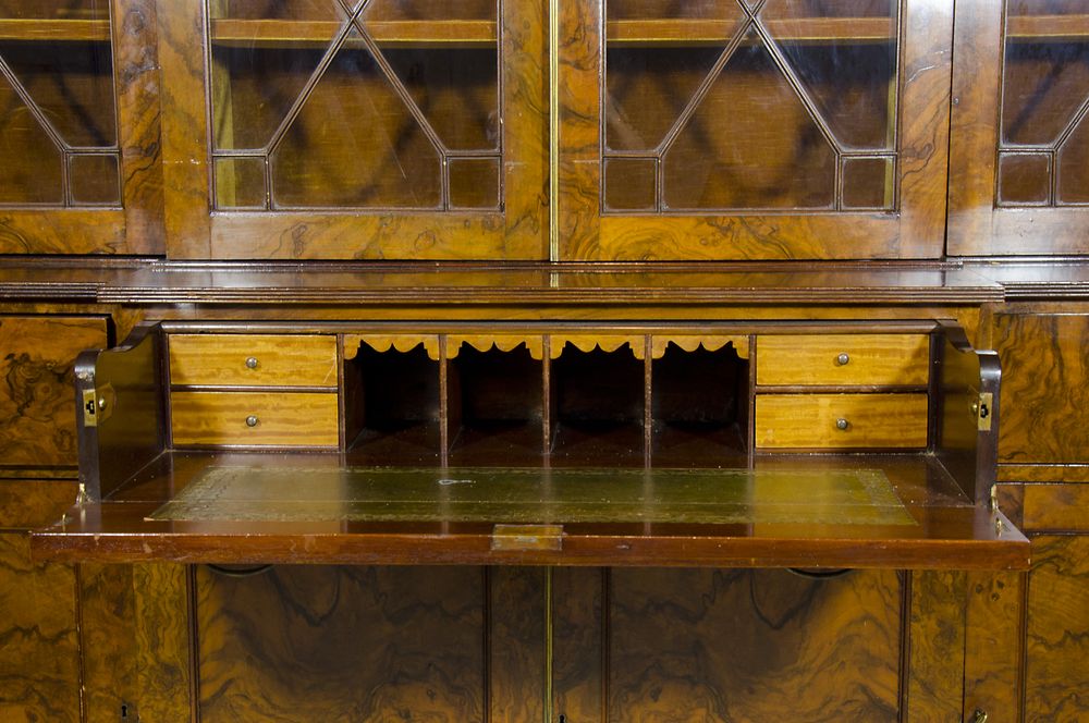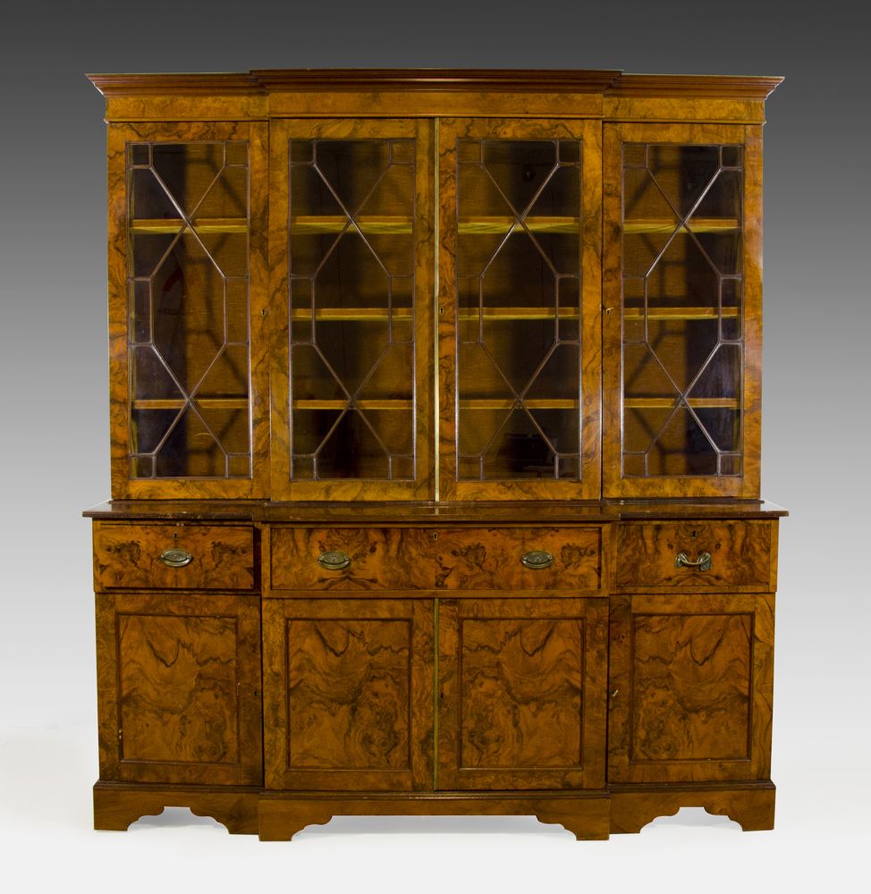 Grande credenza in legno a doppio corpo, parte inferiore a 4 ante, 2 cassetti laterali e ribalta centrale, parte superiore a 4 ante a vetri. XIX secolo. cm. 220x200x53.