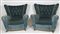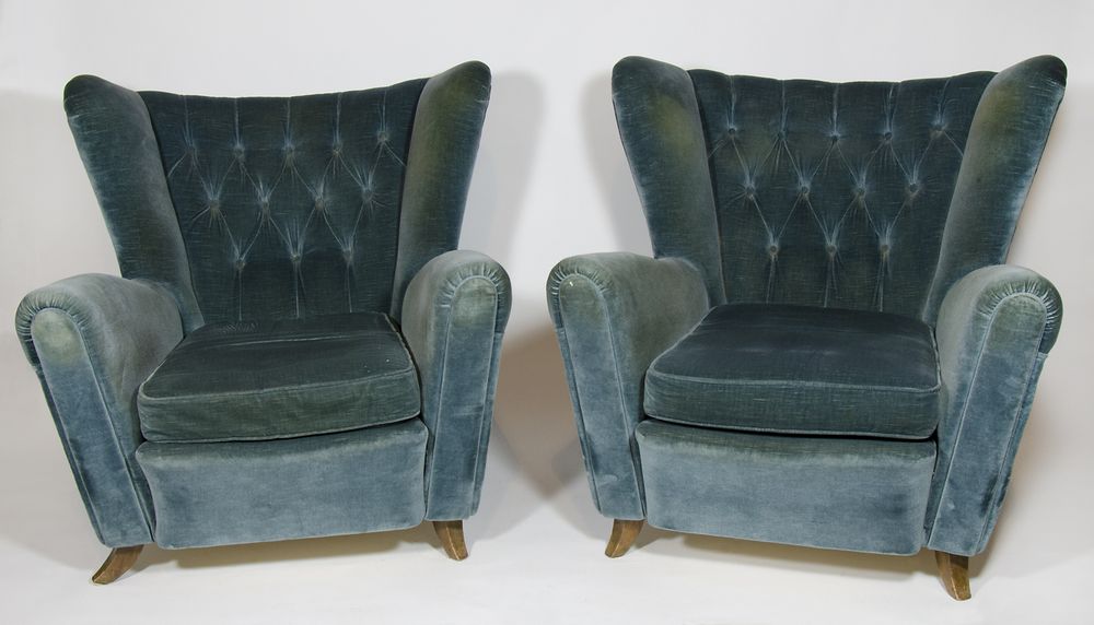 Coppia di poltrone ad orecchie rivestite con velluto azzurro.