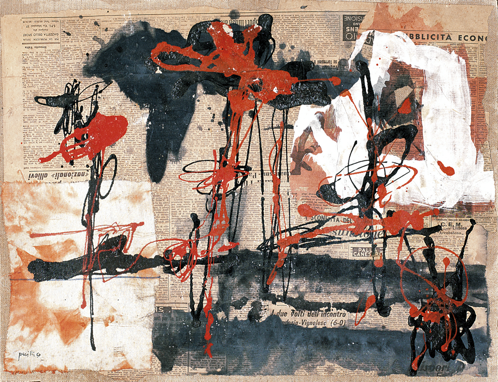 ACHILLE PERILLI Roma 28/01/1927 Lacrime per l'anarchia, 1957 tecnica mista su tela (carta intelata) cm. 42x54,5; firma e anno in basso a sinistra, titolo, firma e anno al retro, dichiarazione d'autenticità dell'artista e archivio su foto.