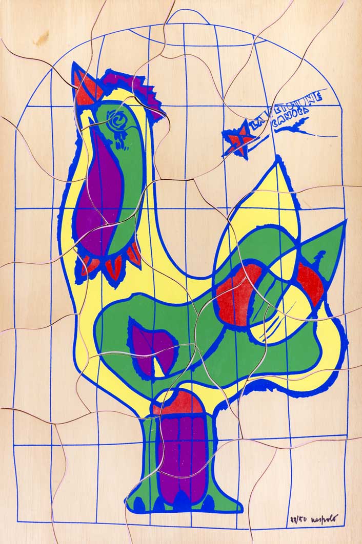 La prigione canora, 1972, Libro, es. 1/200 contenente 3 serigrafie firmate a matita, di cui una a doppia pagina e una da ritagliare e assemblare con appositi fili colorati. Il volume è accompagnato da un puzzle in legno colorato, es. 23/50 firmato in basso a destra, Giancarlo Prearo Editore, Dimensioni del libro: 28 x 20 cm