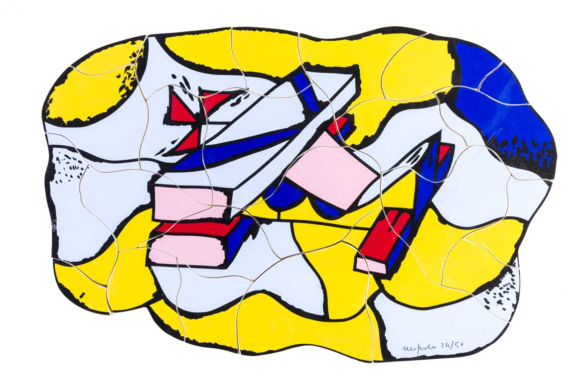 Lo vedi, vola da te, 1972, Libro, es. 1/200 contenente 3 serigrafie firmate a matita, di cui una a doppia pagina e una da ritagliare e assemblare con appositi fili colorati. Il volume è accompagnato da un puzzle in legno colorato, es. 24/50 firmato in basso a destra, Giancarlo Prearo Editore, Dimensioni del libro: 28 x 20 cm