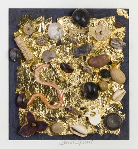 Assemblage di oggetti vari su cartoncino applicato su faesite