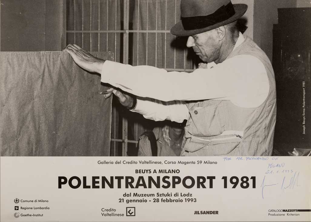 Manifesto della Mostra 'Beuys a Milano - Polentransport 1981 - dal Museo Sztuki di Lodz', tenutasi presso la Galleria del Credito Valtellinese,Milano, 21 gennaio - 28 febbraio 1993