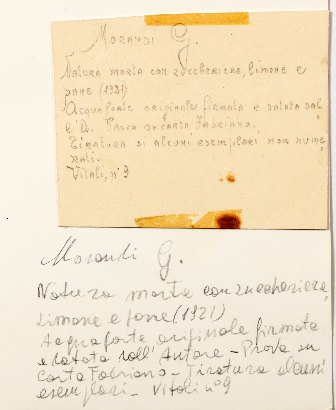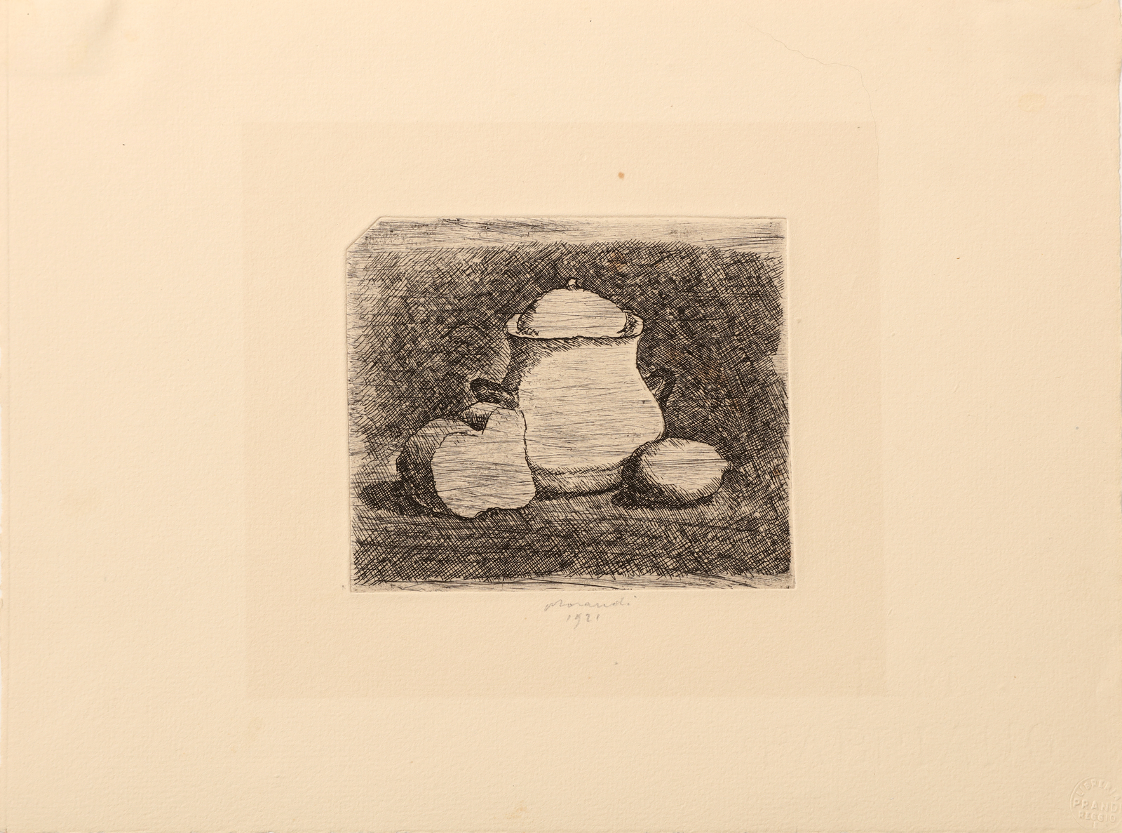 MORANDI GIORGIO (1890 - 1964) Still life with sugar bowl, lemon, bread. 1921. Etching. Cm 25,00 x 19,00. Signature and year lower in pencil. Prandi Library, Reggio Emilia ' stamp lower right. Plate size: 8.5 x 9.5 cm. No edition.