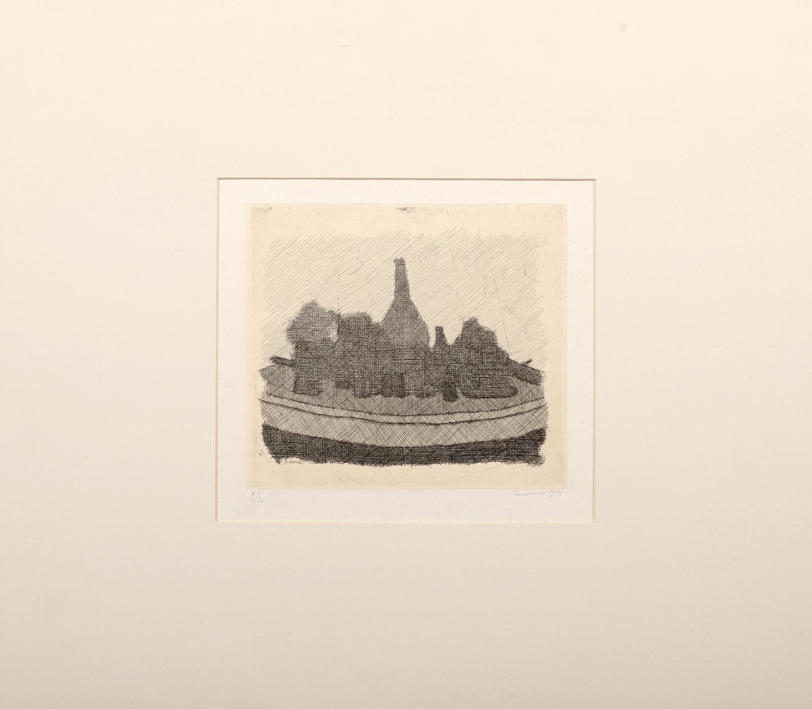 MORANDI GIORGIO (1890 - 1964) Different objects on the table. 1931. Etching. Cm 45,00 x 29,00. 9/30. Edition, signature and year lower in pencil. Signature lower left in plate. Plate size: 17.5 x 19.4 cm. Publication: Giorgio Morandi - graphic work by Lamberto Vitali, Einaudi, 1964, im. 87.