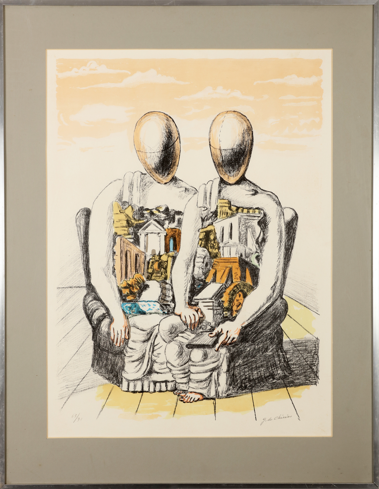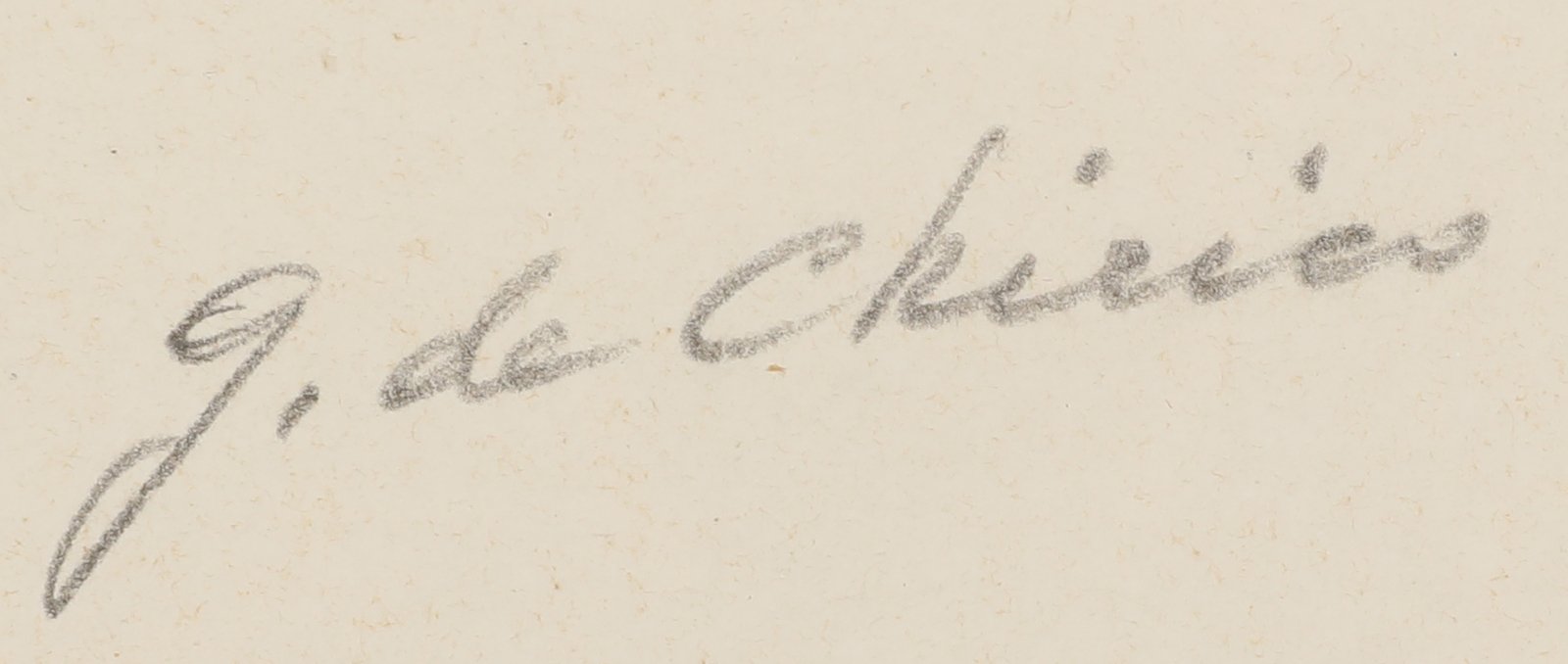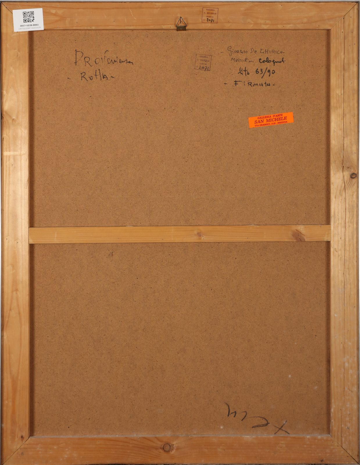 DE CHIRICO GIORGIO (1888 - 1978) Senza titolo. Litografia. Cm 50,00 x 70,00. 63/90. Tiratura e firma a matita in basso. Timbro a secco Alberto Caprini stampatore, Roma in basso a destra. Al retro timbro Galleria S. Michele, Brescia. Cornice presente