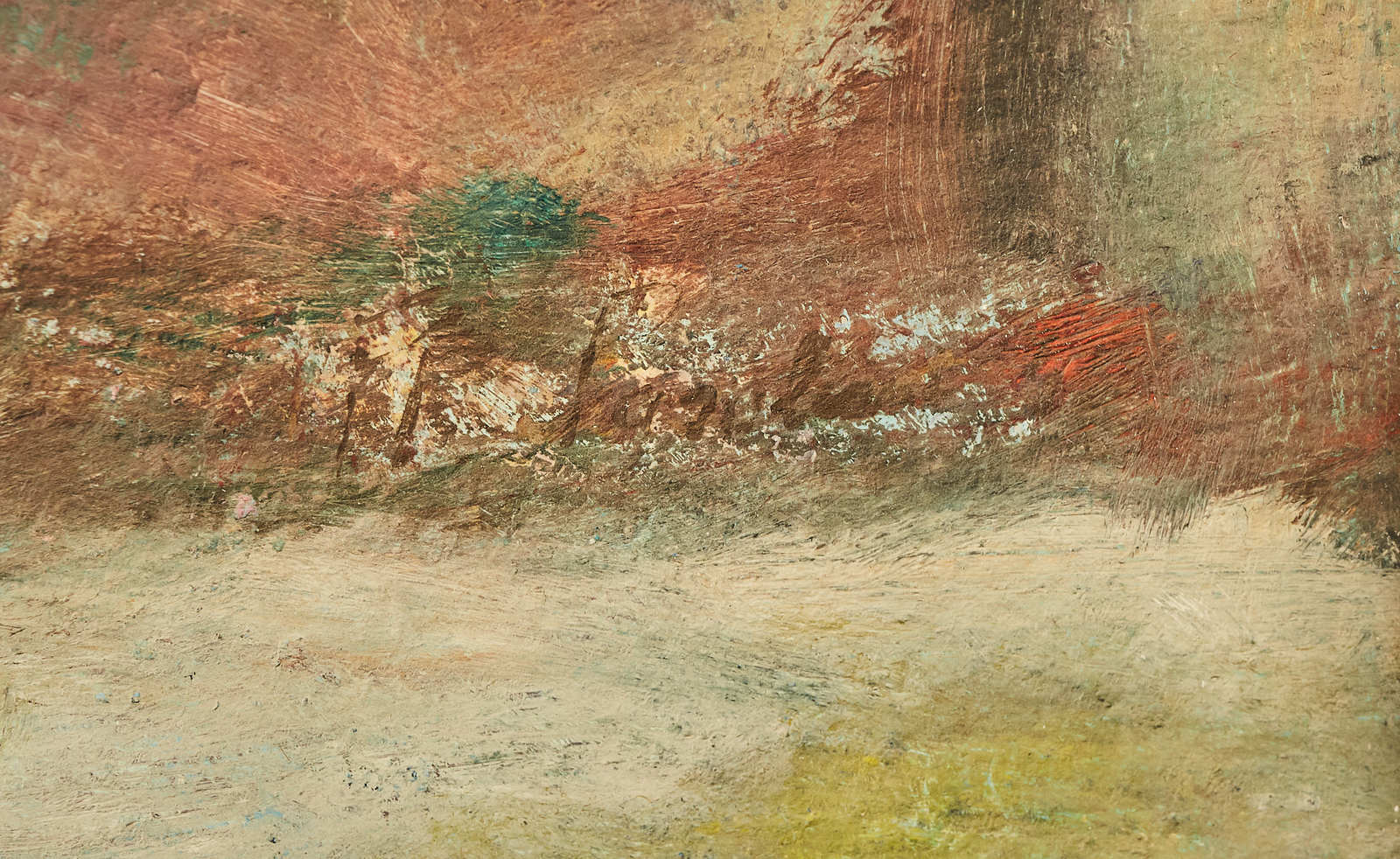 PIER PAOLO PASOLINI (1922 - 1975) Landscape. 1943. Oil on canvas . Cm 51,00 x 60,00. Signature and year lower right. Cornice presente