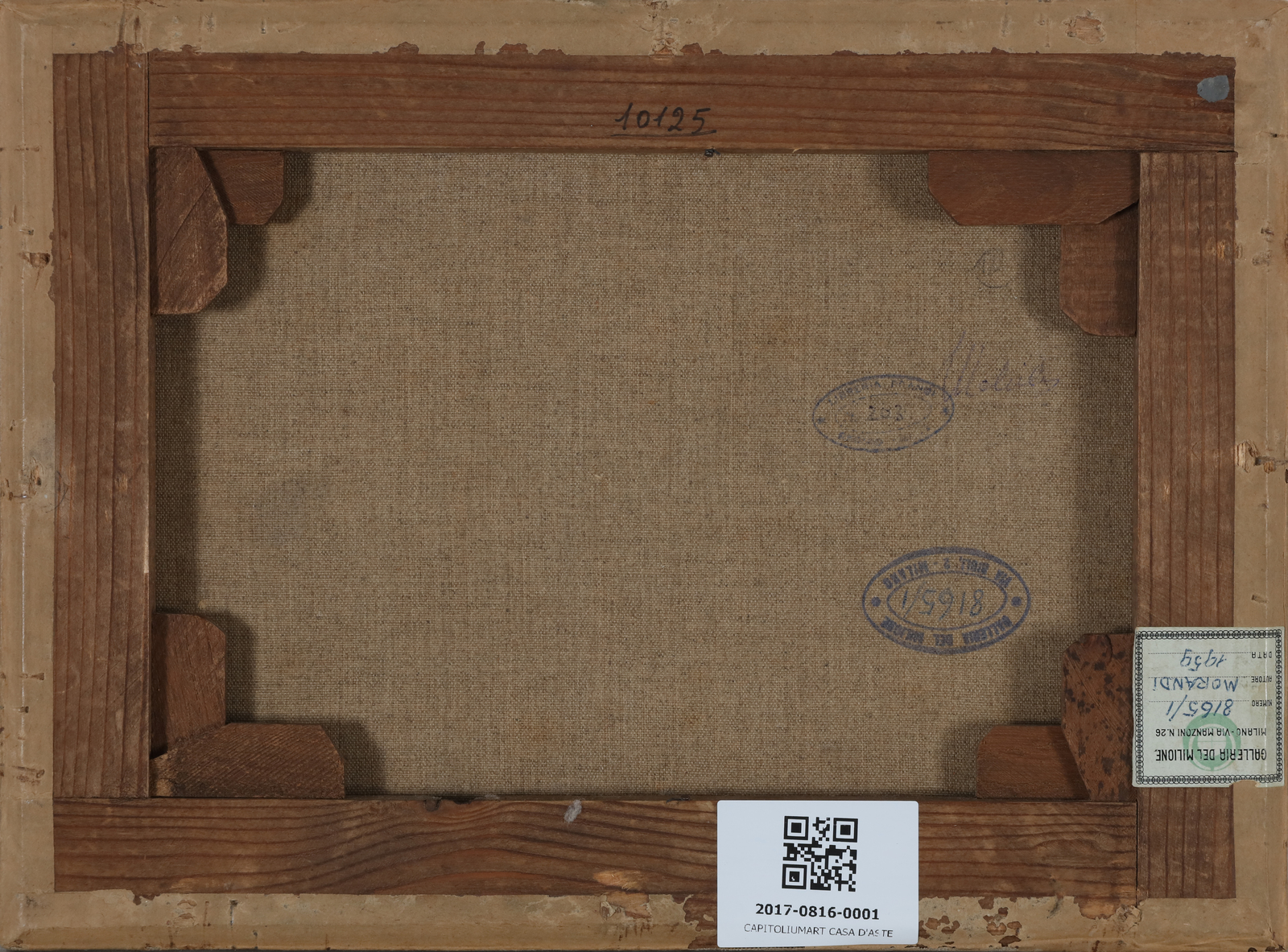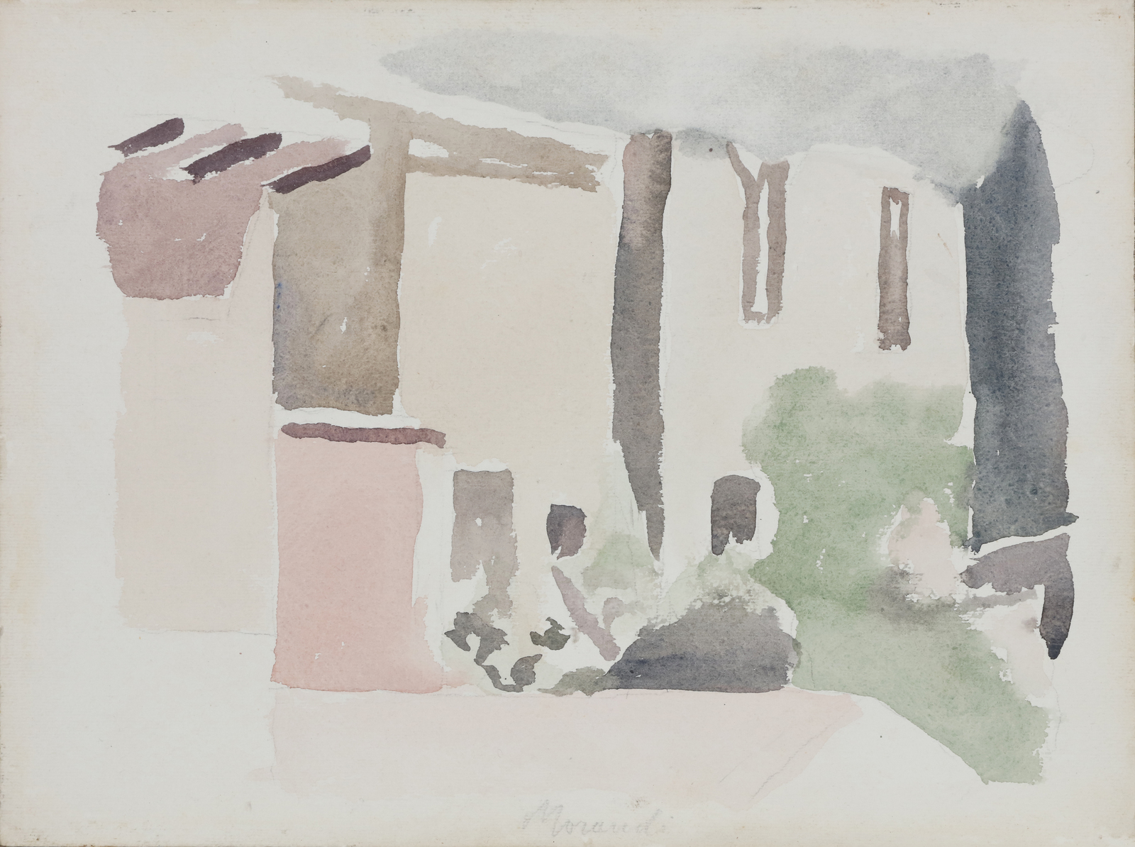 MORANDI GIORGIO (1890 - 1964) Landscape. 1958. Watercolour on paper on canvas. Cm 33,60 x 25,00. Signature lower center. At the back Il Milione Gallery label and stamp. Francesco Arcangeli authenticity certificate on photo with Il Milione Gallery stamp. Pubblication: Jean Leymarie, Morandi's watercolors, De' Foscheri Editor, Bologna, 1968, p. 27. Giorgio Morandi Archive's authenticty certificate on photo.
